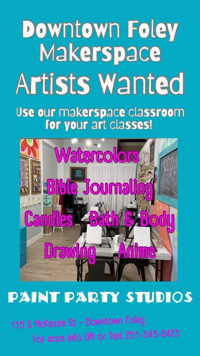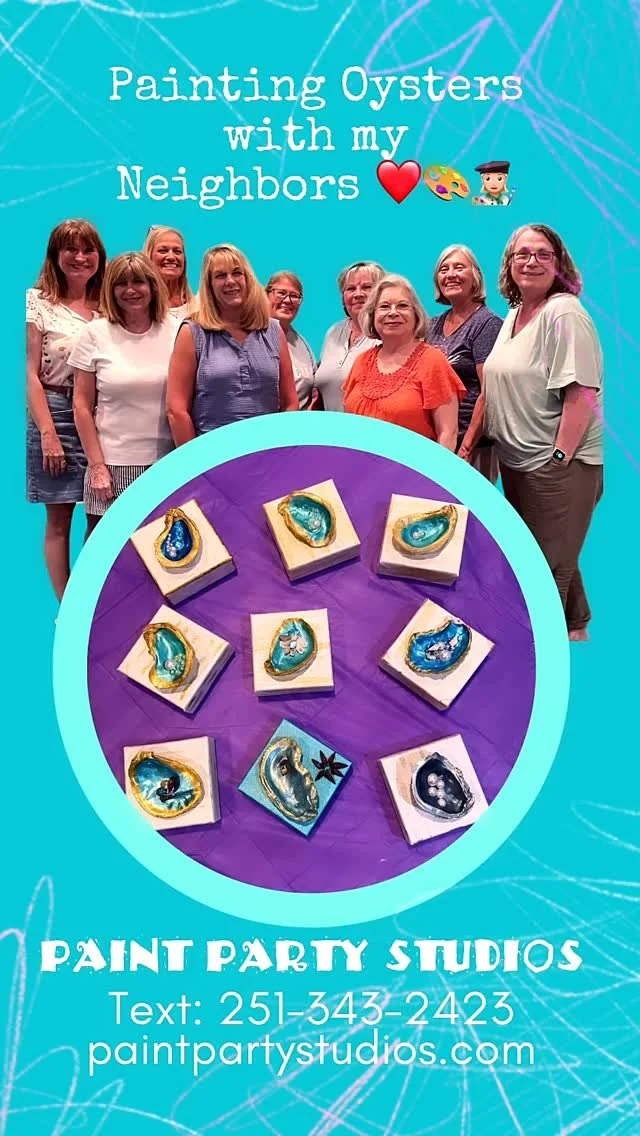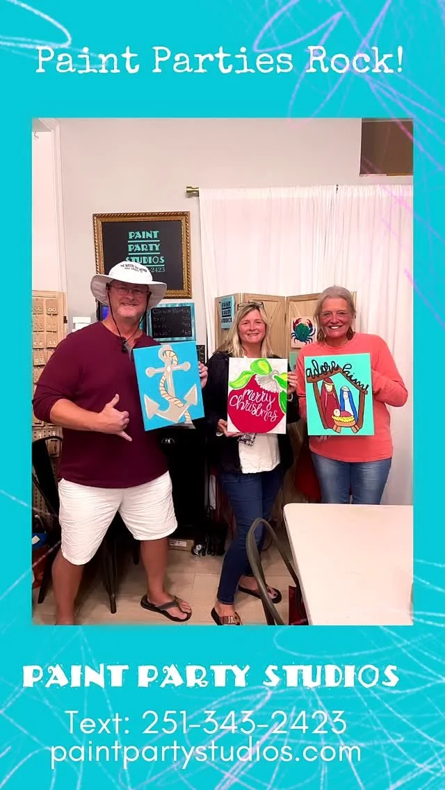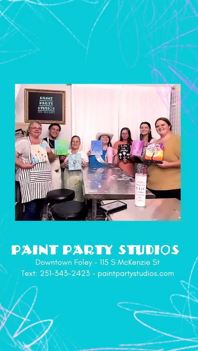 Choose from any of the paint party class options listed below or ask us to create a custom class for your private paint party. Open By Appointment in Downtown Foley or at your Corporate Retreat, School, Church, HOA Clubhouse, RV Park, Bar / Restaurant or Business Offices in Mobile or Baldwin County. We also offer to-go pre-sketched canvases & paint party kits for you to host your own paint party at your home or beach condo. Email or Text Courtney for more info or to book your party.